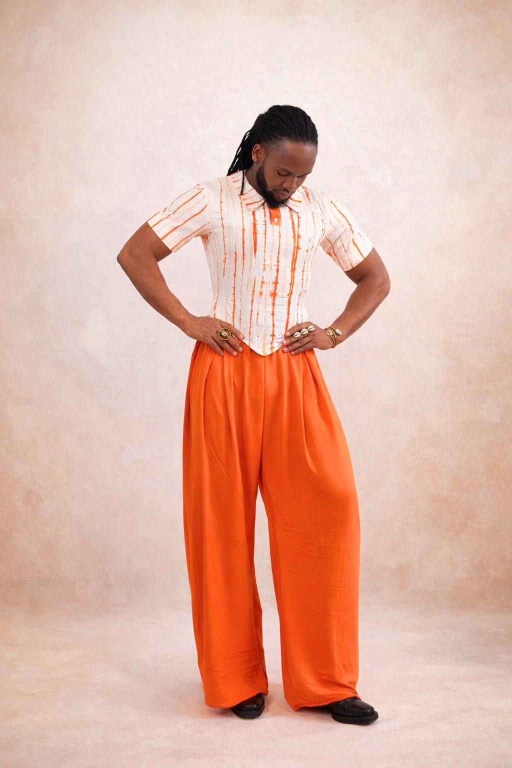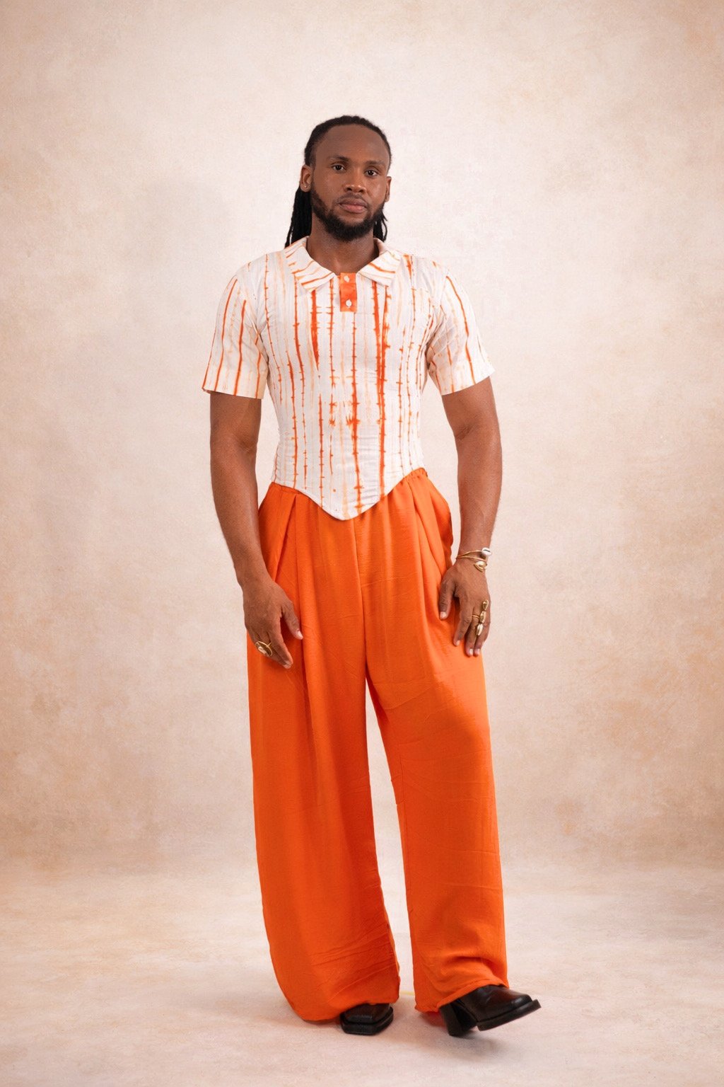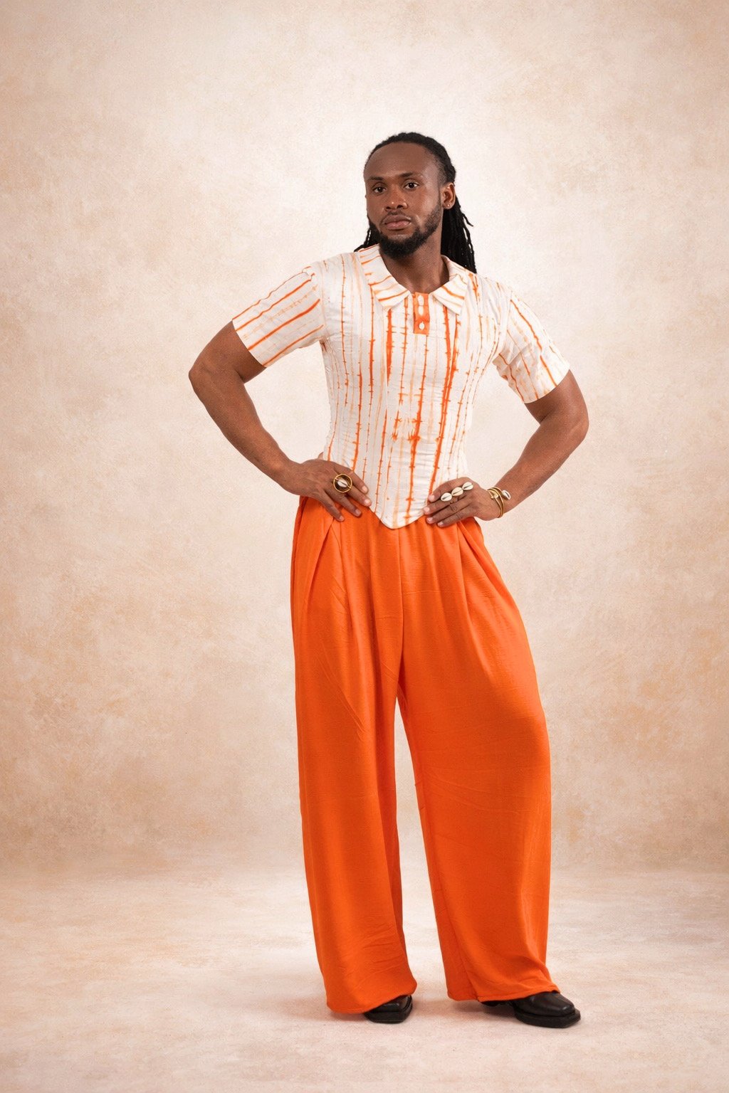 LAGOS incarne une élégance contemporaine, ancrée dans une esthétique forte et assumée. Le haut, confectionné en coton, intègre un corset interne qui structure le buste et affirme la posture avec précision. Il épouse le corps tout en offrant un maintien subtil et maîtrisé.