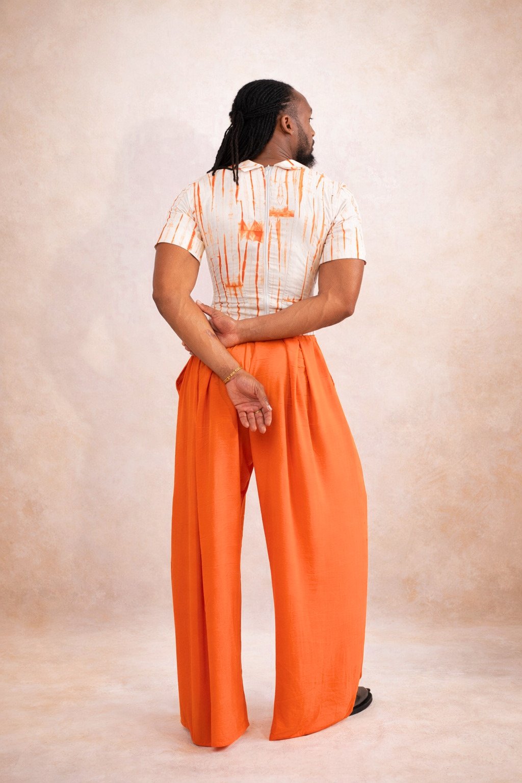 En contraste, le pantalon en crêpe se déploie avec amplitude, apportant fluidité et mouvement à chaque pas. Cette dualité entre structure et liberté crée une allure singulière, immédiatement reconnaissable. Les motifs tie & dye verticaux, déclinés dans des nuances de bleu profond, allonge la silhouette et renforce la signature visuelle de la pièce.