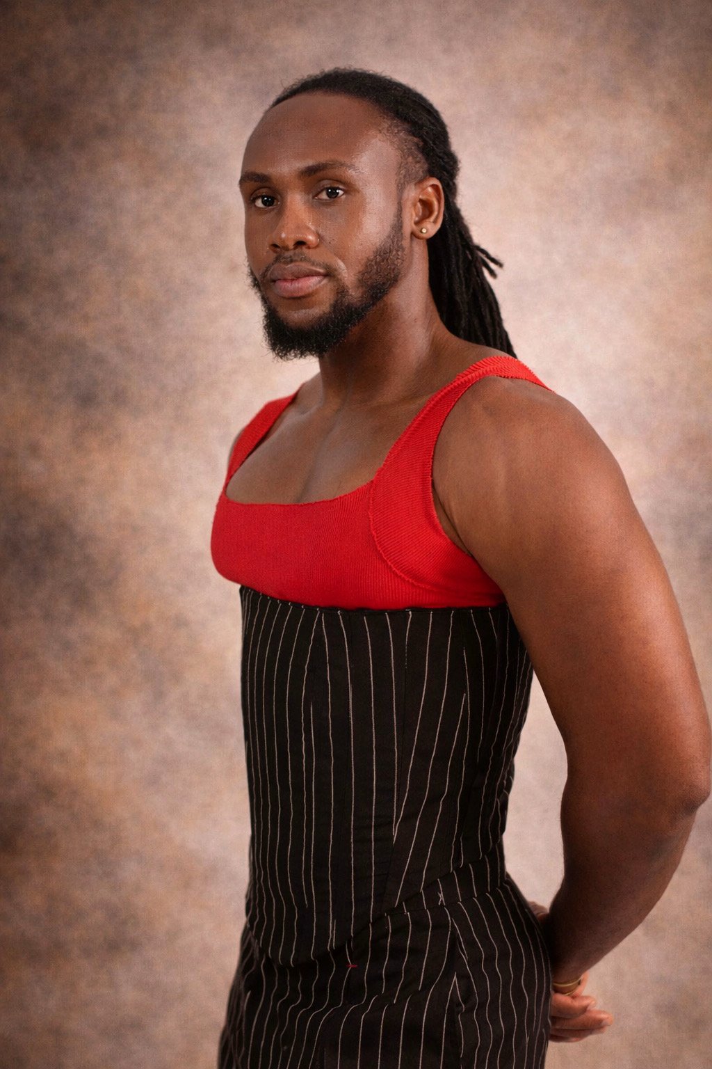 TADJIN explore une élégance audacieuse à travers un contraste visuel puissant. Le haut structuré, intégrant un corset interne, redessine le buste avec précision et impose une posture nette, presque architecturale. La partie supérieure, en matière extensible, épouse le corps et accentue la tension de la silhouette.