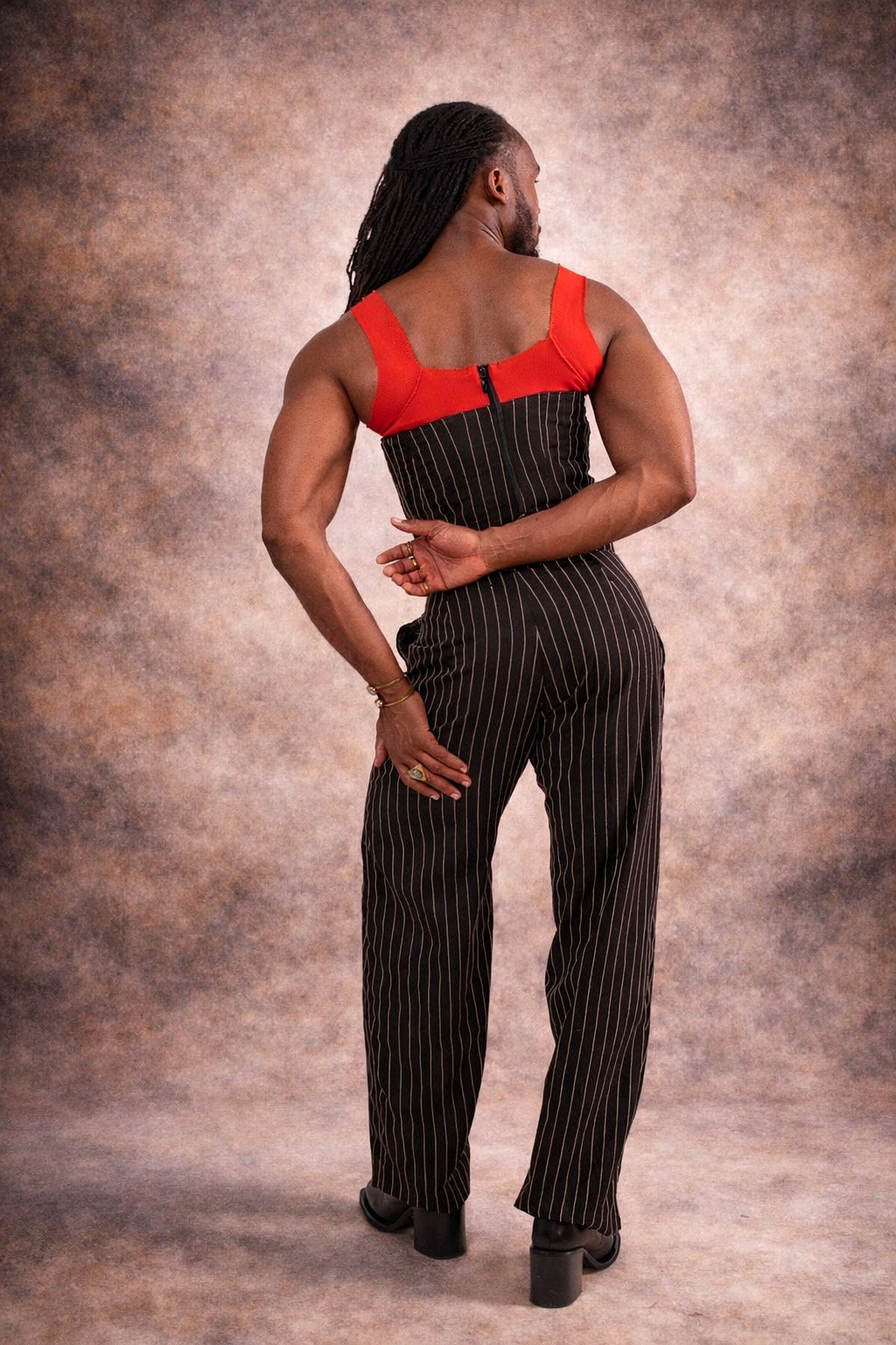La base en coton à rayures verticales renforce cette construction en allongeant visuellement l’allure et en affirmant une présence forte. Le pantalon, dans la continuité du haut, apporte équilibre et fluidité, sans jamais perdre en caractère.